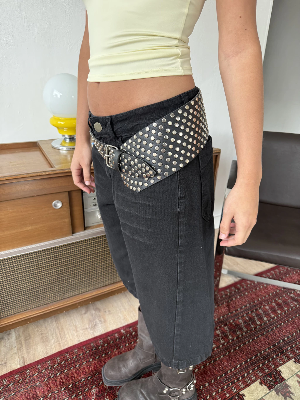 Bermuda de jean rígida, oversized, color negro. (El lavado de la tela puede variar).