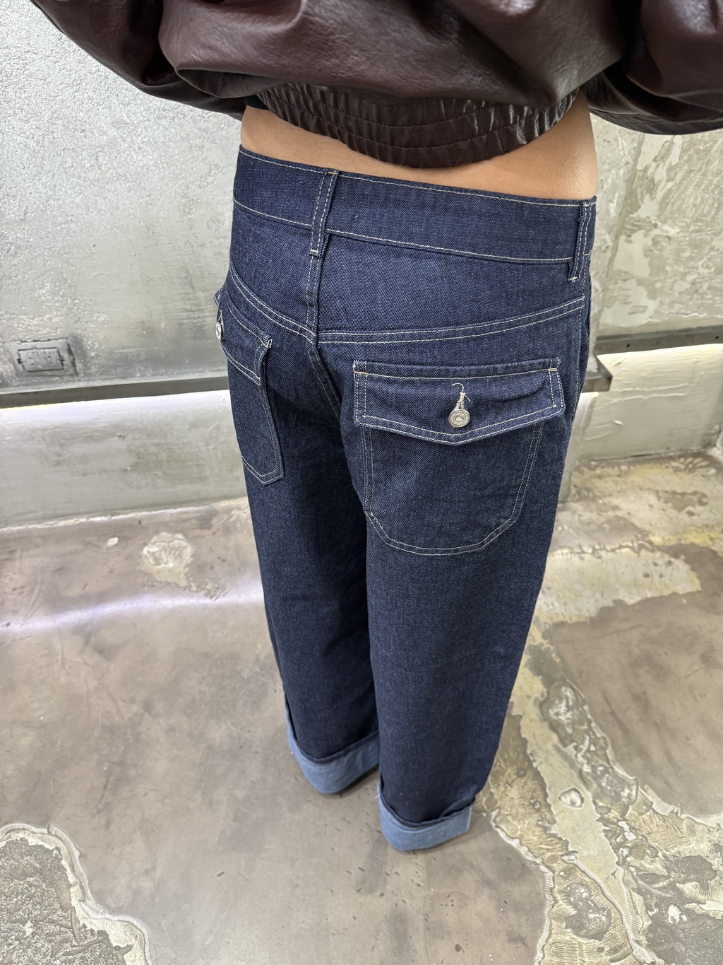 Jean rígido tiro bajo/medio, color azul, con botamangas y bolsillos con solapa.