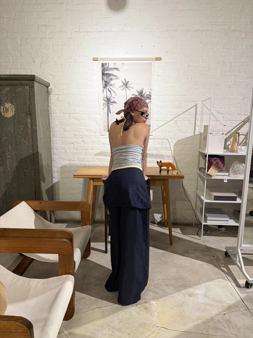 Pantalón wide leg, con cierre lateral en cintura y sobrefalda ajustable.
